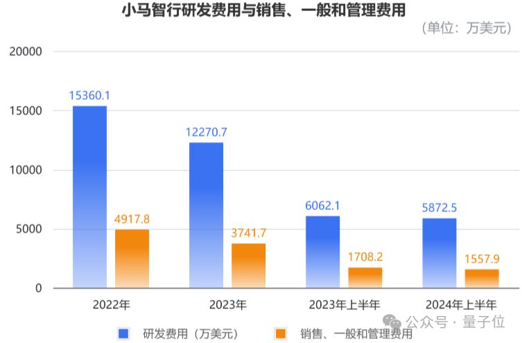 运营费用当中,研发费用为主要的运营支出。2022年、2023年以及2024年上半年,小马智行的研发费用分别为15360万美元(约10.9亿元)、12271万美元(约8.7亿元),以及5872.5万美元(约4.2亿元)。
