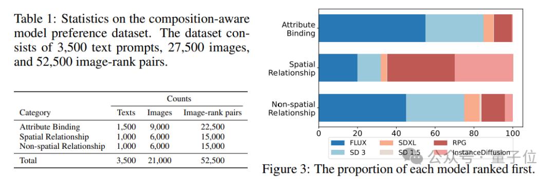 为此,研究人员收集了不同模型在这些方面的偏好数据,并通过人工排序,构建了⼀个面向组合生成的模型偏好数据集(composition-aware model preference dataset)。