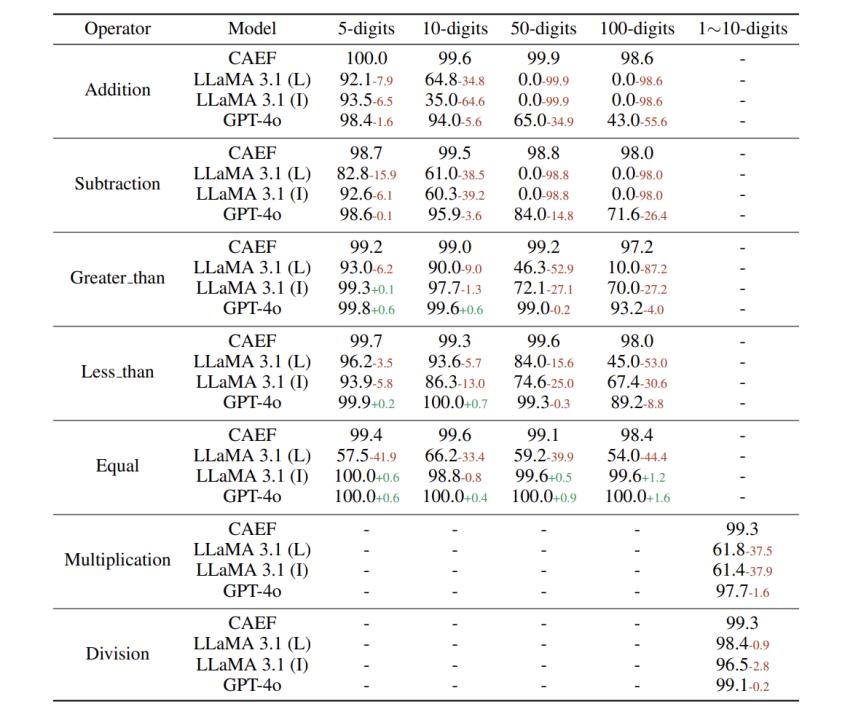 计算准确率:实验结果表明,基于 CAEF 的 LLaMA 3.1-8B 在这七个运算符上的表现优于现有的 LLM,且能够在操作数高达 100 位时实现几乎 100% 的准确率。