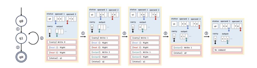应包含:1) 进位和输出的写入,2) 移动指针的操作、 3) 计算状态的转换。基于该思路,可以构建加法的抽象执行流程,如图 2 左侧的自动机图所示。以 “45+67=” 这个问题为例,图 2 的右侧展示了 executor 的完整执行流程。完整的文本形式转换过程如下:
