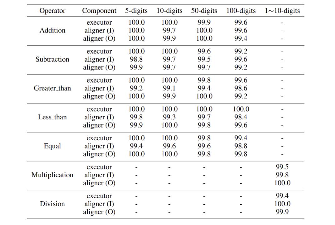 为了进一步探索 executor 和 aligner 在计算过程中的实际性能,该工作在同一数据集上分别进行了评估。如表 2 所示,可以观察到,即使 executor 必须以迭代方式反复生成中间计算步骤,而 aligner 只执行两个转换步骤,但 executor 的整体性能仍然优于 aligner。executor 在所有实验设置中都达到了 99% 以上的准确率,说明当提供正确的初始状态和命令时,它在绝大多数情况下都能有效工作。另一方面,在大多数情况下,与转换 executor 的输出相比,aligner 在转换原始输入时表现出较低的精度,这表明整个计算过程的瓶颈在于操作数的翻转,而不是计算本身。