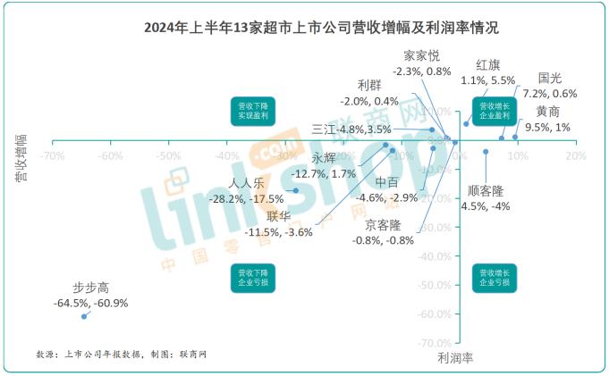 据联商网统计,2024年上半年13家已披露半年报的超市上市公司,近六成营收下降,近五成利润下降,近六成利润不健康,近五成企业处在“营收下滑、企业亏损”的区域。