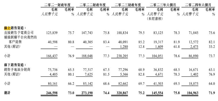 2021年-2023年公司线上销售毛利率分别为76.9%、77.3%、77.3%,其中2023年1月-6月线上销售的毛利率为78.6%, 而2024年1月-6月已降到73.7%。