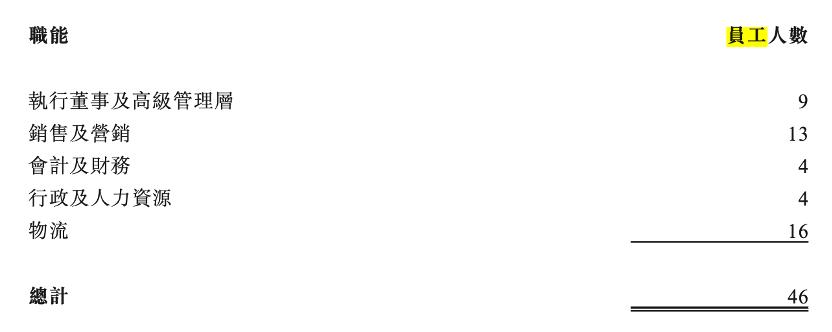 招股书显示,报告期内,公司员工由9名执行董事及高级管理层、13名销售及营销、4名会计及财务、4名行政及人力资源以及16名物流成员组成,并无研发、生产等员工。