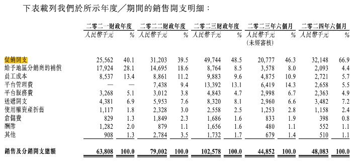 报告期内,公司的促销开支分别约为2556万元、3120万元、4974万元以及3215万元,分别占总销售费用的40%、39.5%、48.5%以及66.9%, 从2023年开始大幅度增加。