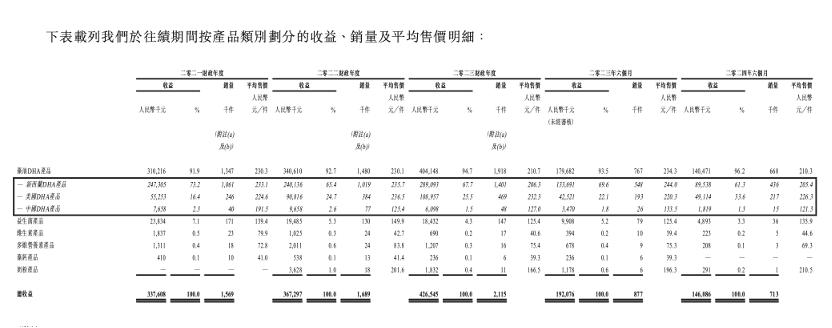 其中,藻油DHA产品是纽曼思的主要产品。报告期内,藻油DHA产品的收益分别约为3.10亿元、3.41亿元、4.04亿元以及1.80亿元; 分别占总收益的约91.9%、92.7%、94.7%、93.5%及96.2%。
