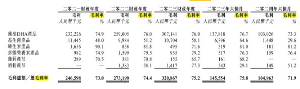 “降价策略”虽然让销量有了明显的提升,但是毛利率的下滑也是显而易见。报告期内,藻油DHA产品的毛利率分别为74.9%、76.0%、76.0%以及73.3%,2024年1月-6月已有下滑迹象。
