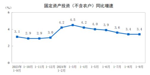 投资方面,1月-9月,全国固定资产投资(不含农户)378978亿元,同比增长3.4%,比1月-6月(3.9%)回落0.5个百分点。
