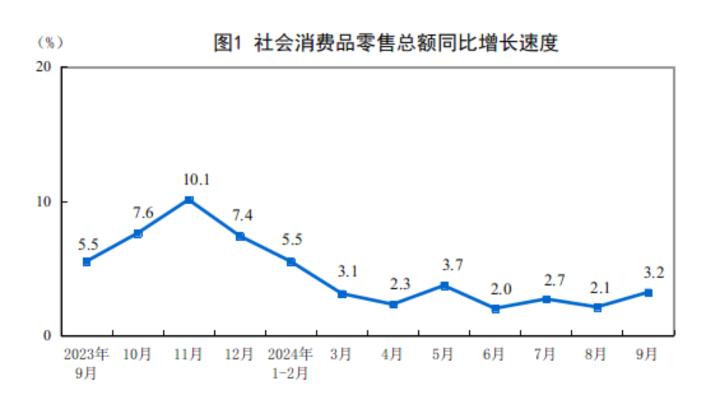 10月18日,国家统计局公布了前三季度中国宏观经济运行情况。数据显示, 三季度各项经济指标出现了回落。消费方面,1月-9月,社会消费品零售总额353564亿元,同比增长3.3%,比1月-6月(3.7%)回落0.4个百分点。