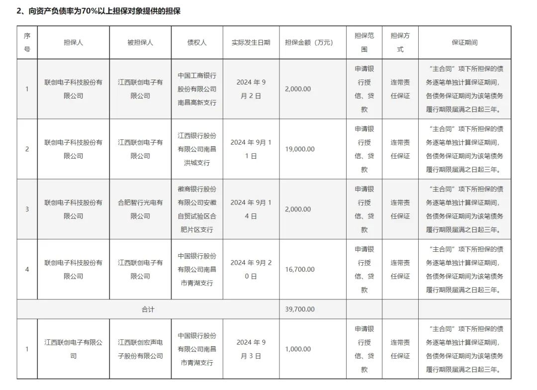 2024年9月,联创电子为合并报表范围内下属公司担保约10.87亿元,全资子公司江西联创电子有限公司(以下简称“江西联创”)为关联公司江西联创宏声电子股份有限公司(以下简称“联创宏声”)担保1000万元。