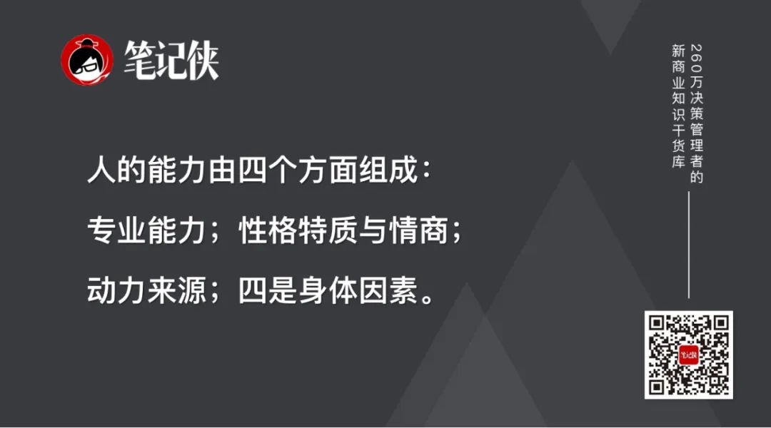 人的能力通常由四个方面组成:一是专业能力,即解决问题的能力;二是性格特质与情商,比如性格非常坚毅,在逆境和挫折中能够逆流而上,或者有很好的沟通能力、调节情绪的能力等;三是动力来源,包含价值体系、愿景、使命等;四是身体因素。