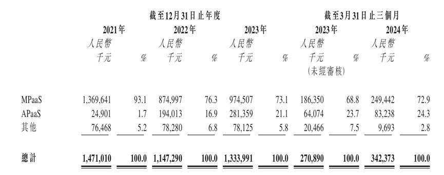 同样,APaaS业务的付费客户数量也呈现出类似的增长态势。从2021年到2023年,付费用户分别为1319名、1967名和2597名。截至2024年3月31日的三个月内,APaaS付费客户数量增长至2303名,相较于前一个季度末的1867名,虽然有所增长,但增速同样不够强劲。