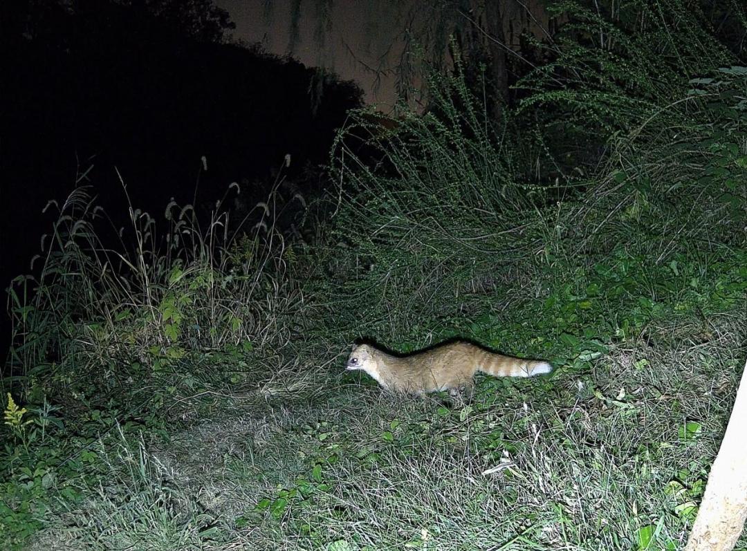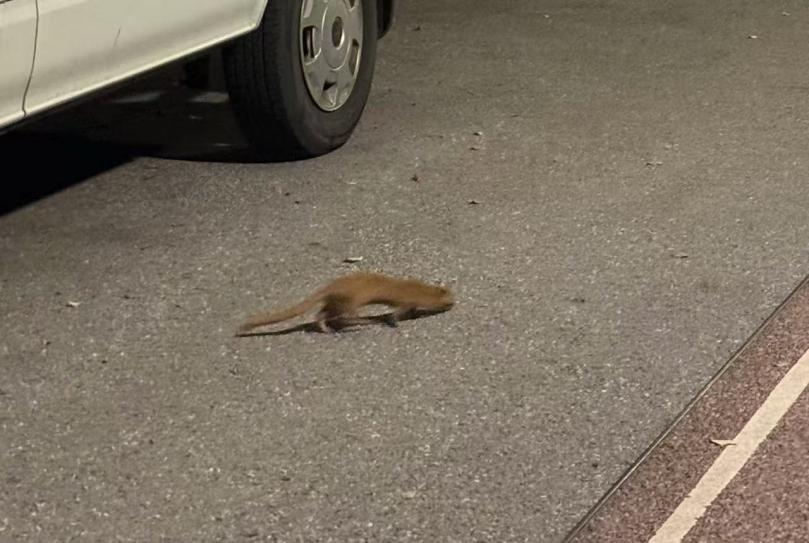 又过了几天,在步道的另一处,我终于和这不明生物四目相对。它先是在树丛里发出介于鸭子和松鼠的声音,凄厉短促,而后飞速窜出,最终在汽车旁边停了下来。它几乎长了个九头身,像是Jerry鼠被拉长的版本。也许是见我们也没有什么威胁,便自如地继续它的夜行任务去了。
