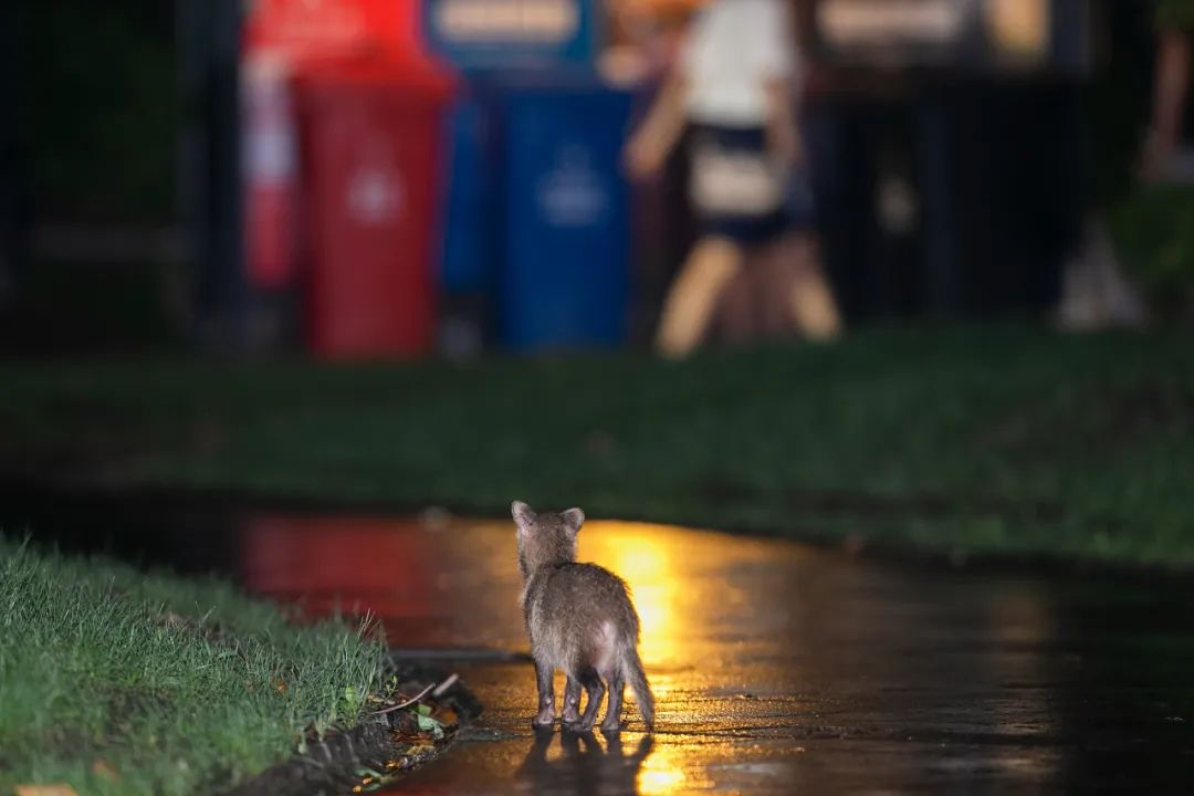 有一次夜很深了,我从河边跑过,树丛里远远就传来了窸窸窣窣的声音,以为是流浪猫在嬉戏。不一会儿,两三只二三十厘米长的长条形棕毛生物彼此追逐着跑过马路,消失在另一边的矮树里。莫非是遇见了硕鼠?而卧在路中间的猫几乎不为所动。