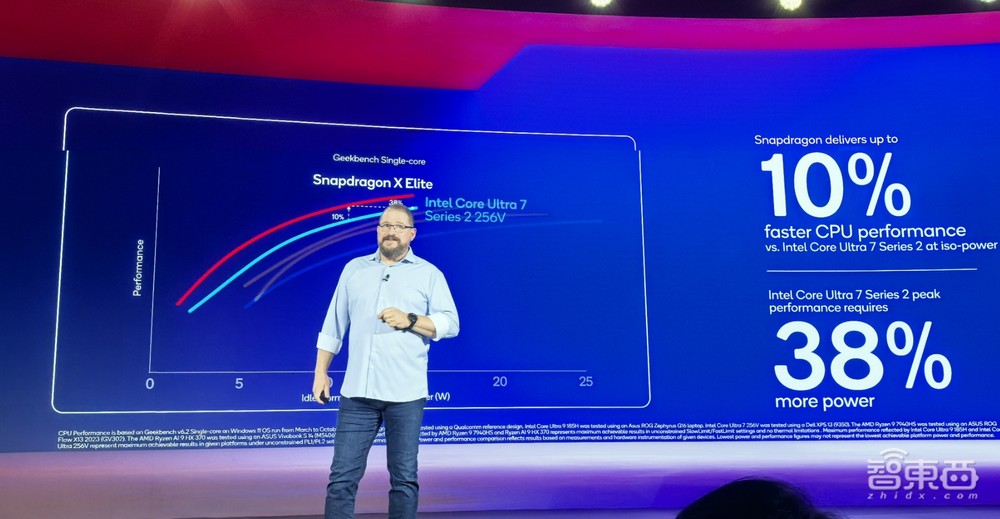 在介绍新笔记本电脑处理器之前,安蒙特意强调说,即便是上一代骁龙X Elite,跟英特尔和AMD最新的移动处理器相比,在能效比方面依然有优势,与英特尔最新的酷睿Ultra 7系列相比,其CPU性能领先了10%,同性能功耗节省了38%。