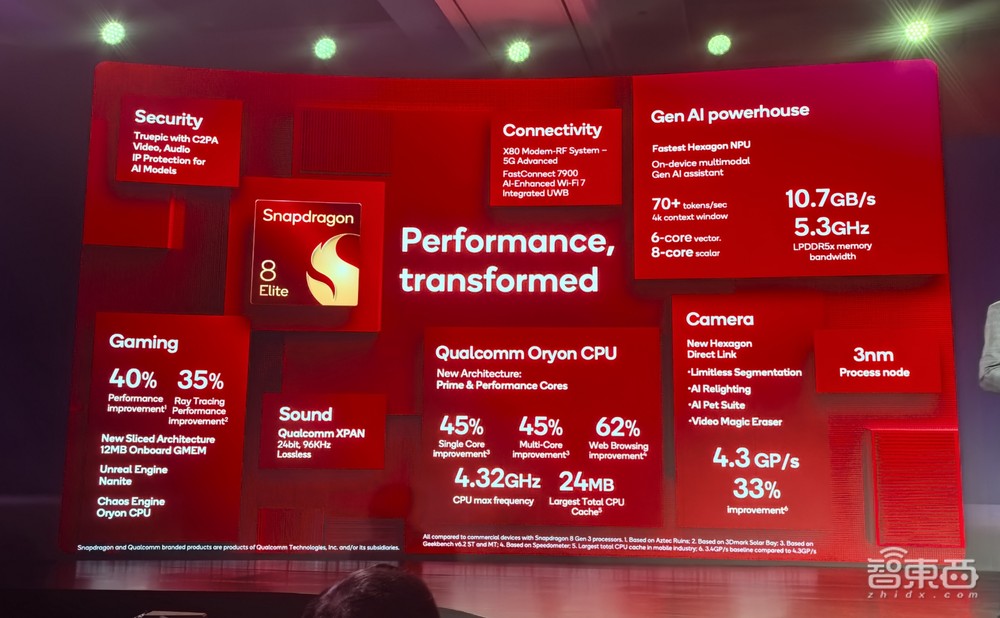 除了AI,骁龙8 Elite在性能和能效方面的提升更加劲爆,其搭载了高通所称的“全球最快的移动端CPU”——第二代定制的高通Oryon CPU,采用了台积电第二代3nm工艺。