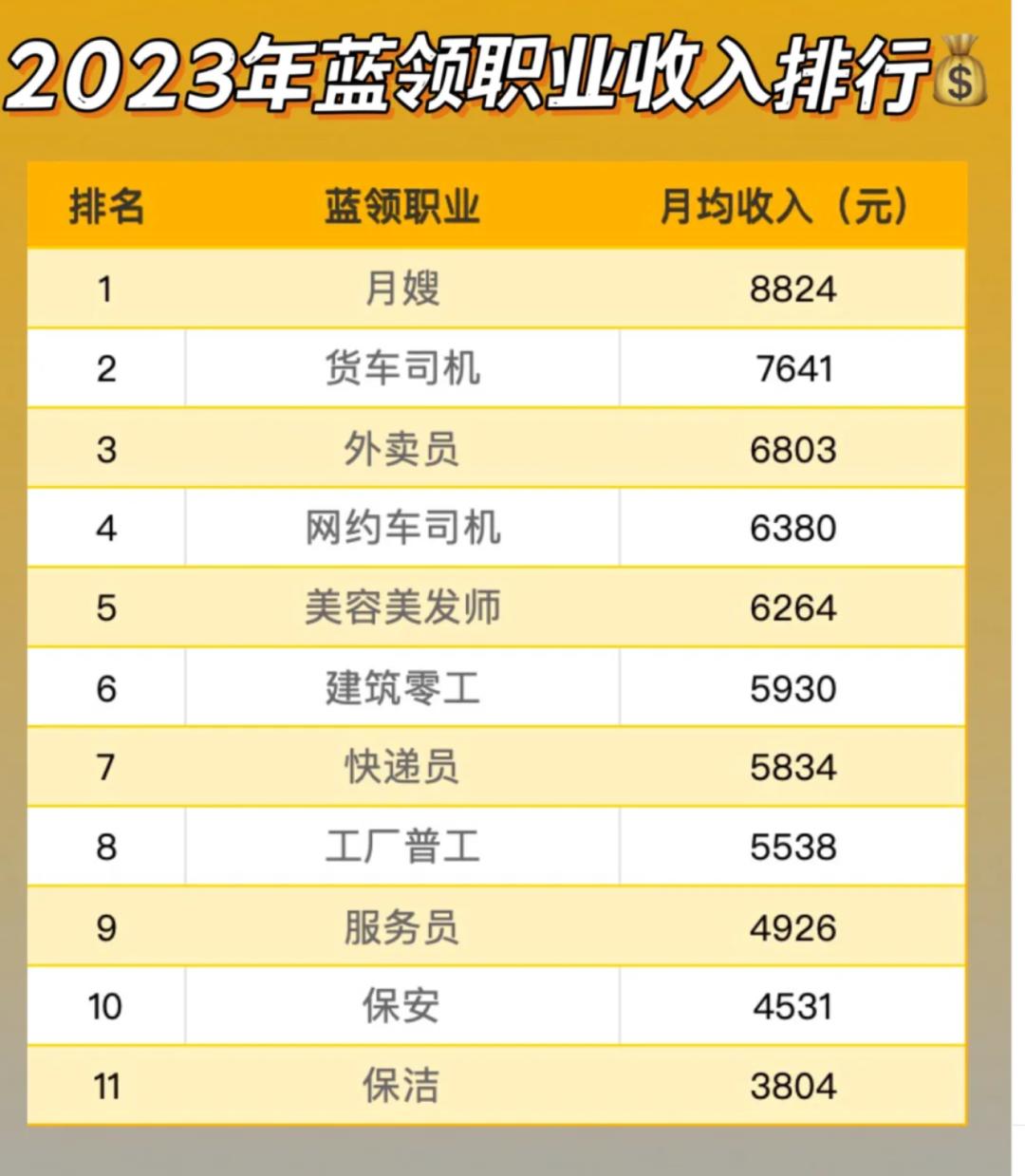根据《2023中国蓝领群体就业研究报告》显示,2023年蓝领群体的月均收入为6043元;而统计局公布的2023年全国城镇私营单位就业人员年平均工资为68340元,月平均为5695元。