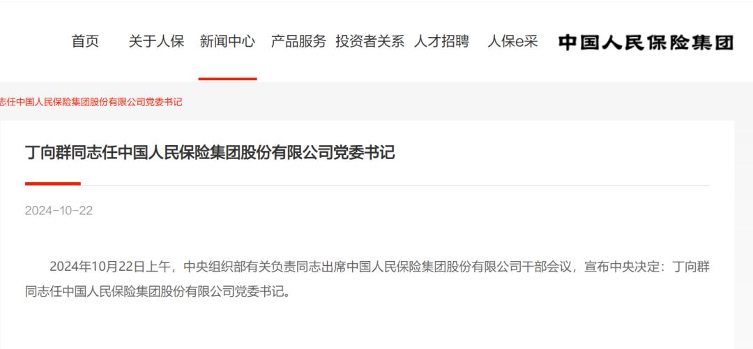 中国人保集团官网消息,2024年10月22日上午,中央组织部有关负责同志出席中国人民保险集团股份有限公司干部会议,宣布中央决定:丁向群同志任中国人民保险集团股份有限公司党委书记。
