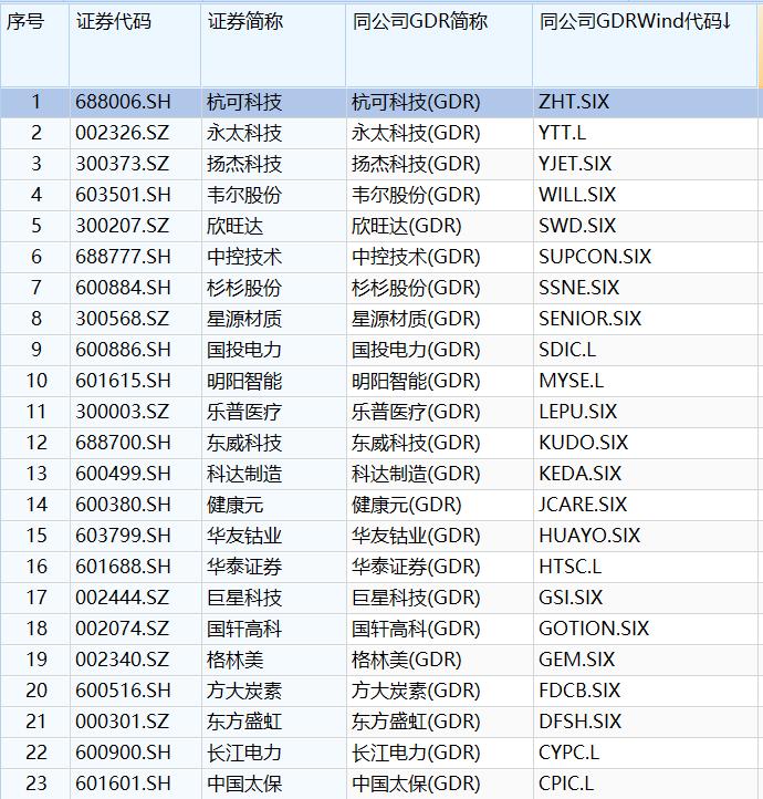 Wind数据显示,截至2024年10月22日,A股已成功发行GDR的公司数量为23家,多于伦交所及瑞交所上市。其中,新能源领域公司居多,包括永太科技(688006.SH)、星源材质(300568.SZ)、欣旺达(300207.SZ)、杉杉股份(600884.SH)、杭可科技(688006.SH)、华友钴业(603799.SH)、国轩高科(002074.SZ)、格林美(002340.SZ)、方大炭素(600516.SH)、长江电力(600900.SH)、东方盛虹(000301.SZ)等。