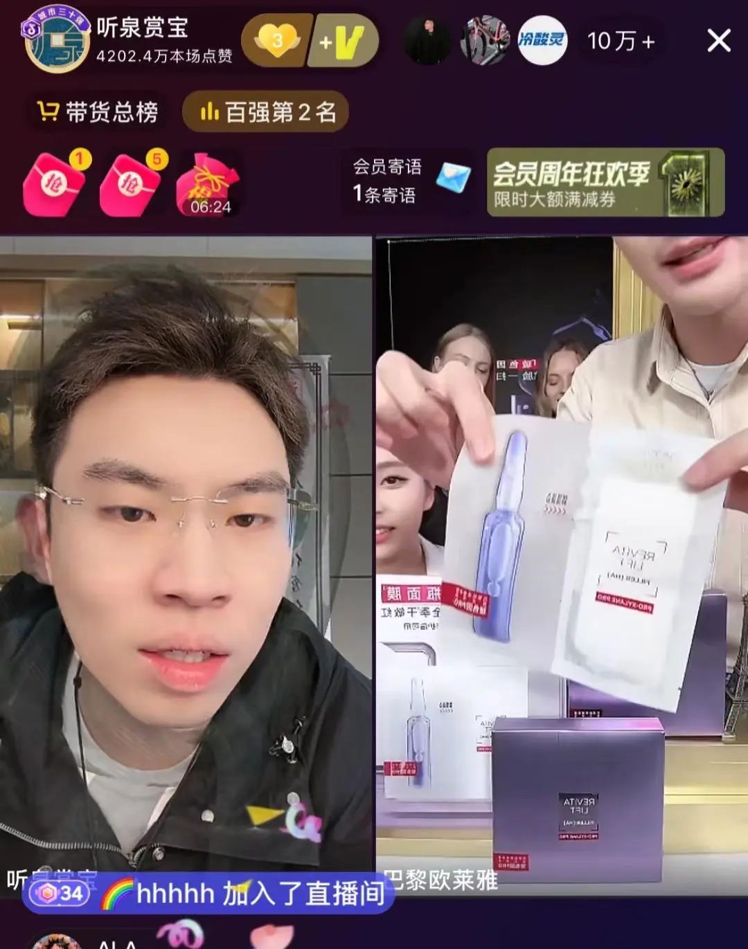 复播没多久,“听泉鉴宝”先是把名字改成了“听泉赏宝”,随后又开启首场直播带货,连线上欧莱雅的官方直播间时,他对着直播间的外国美女说出自己的经典台词“开门”,也顺势引发了一波直播间的弹幕狂欢,“开门,太开门了(真品)”“欧莱雅是懂泉哥的”“怎么不放《春庭雪》(听泉赏宝在看到真品时放的音乐)”……