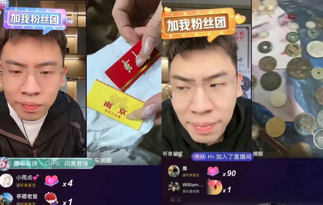 有人拿出玉石奥特曼、骑摩托车的兵马俑、印着听泉赏宝头像的银币;有人秀出自己家的四合院、几百万的真古董;也有疑似“摸金校尉”的神秘人在野外拍摄古墓石碑、带着泥土的古玩……面对众多连麦的观众,听泉赏宝一惊一乍的表现和各种段子,让直播间变成脱口秀现场,直播间的“黑话”和名场面更是被其粉丝演变成互联网的热梗,各类切片视频让听泉赏宝快速出圈和涨粉。