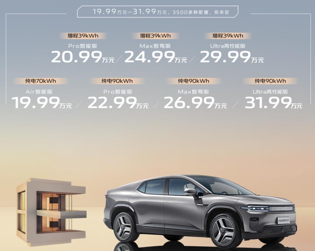 在上个月, E07 给了一个 24.99-31.99 万的预售价,而这次正式售价是19.99-31.99 万。