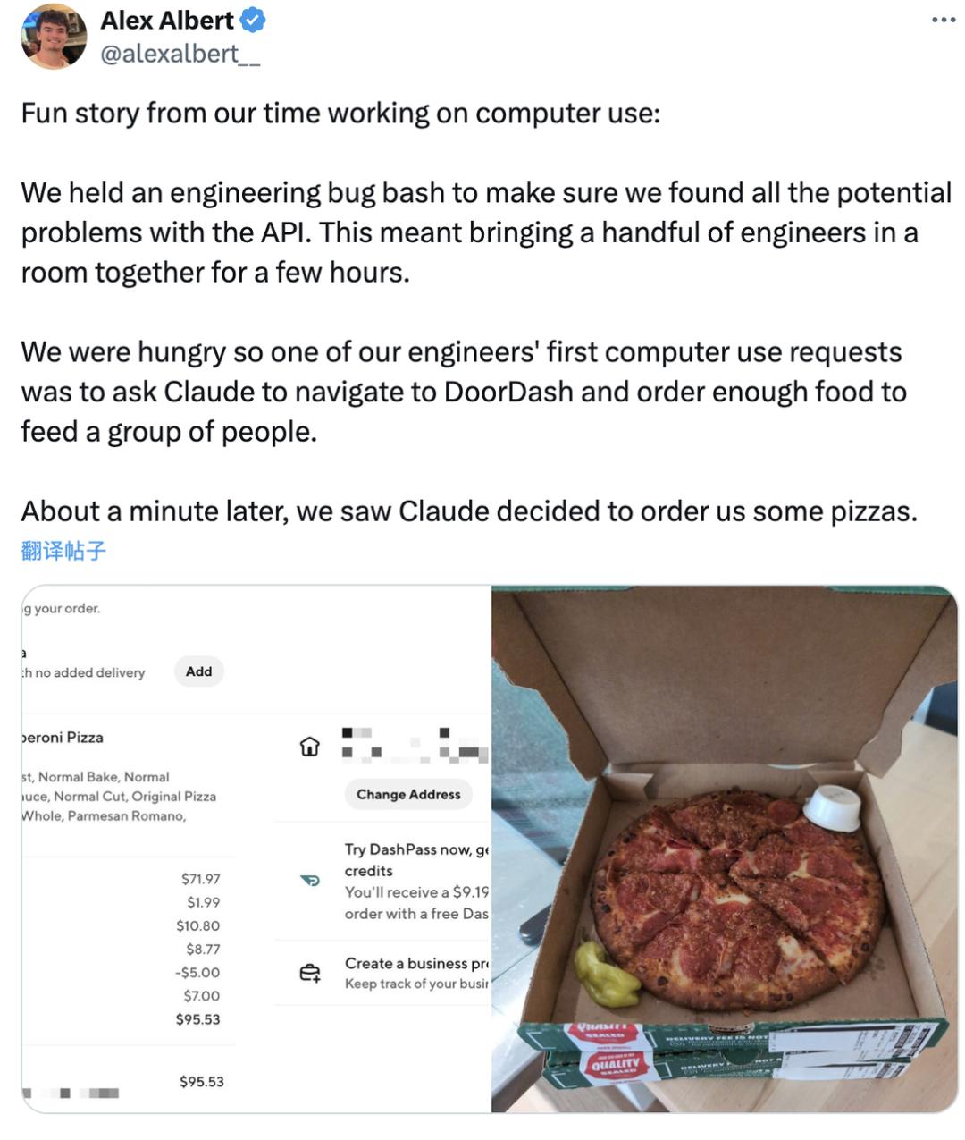 其中一位工程师发出的第一个「computer use 」请求,就是让 Claude 导航到外卖平台 DoorDash 并订购足够的食物来喂饱大家。