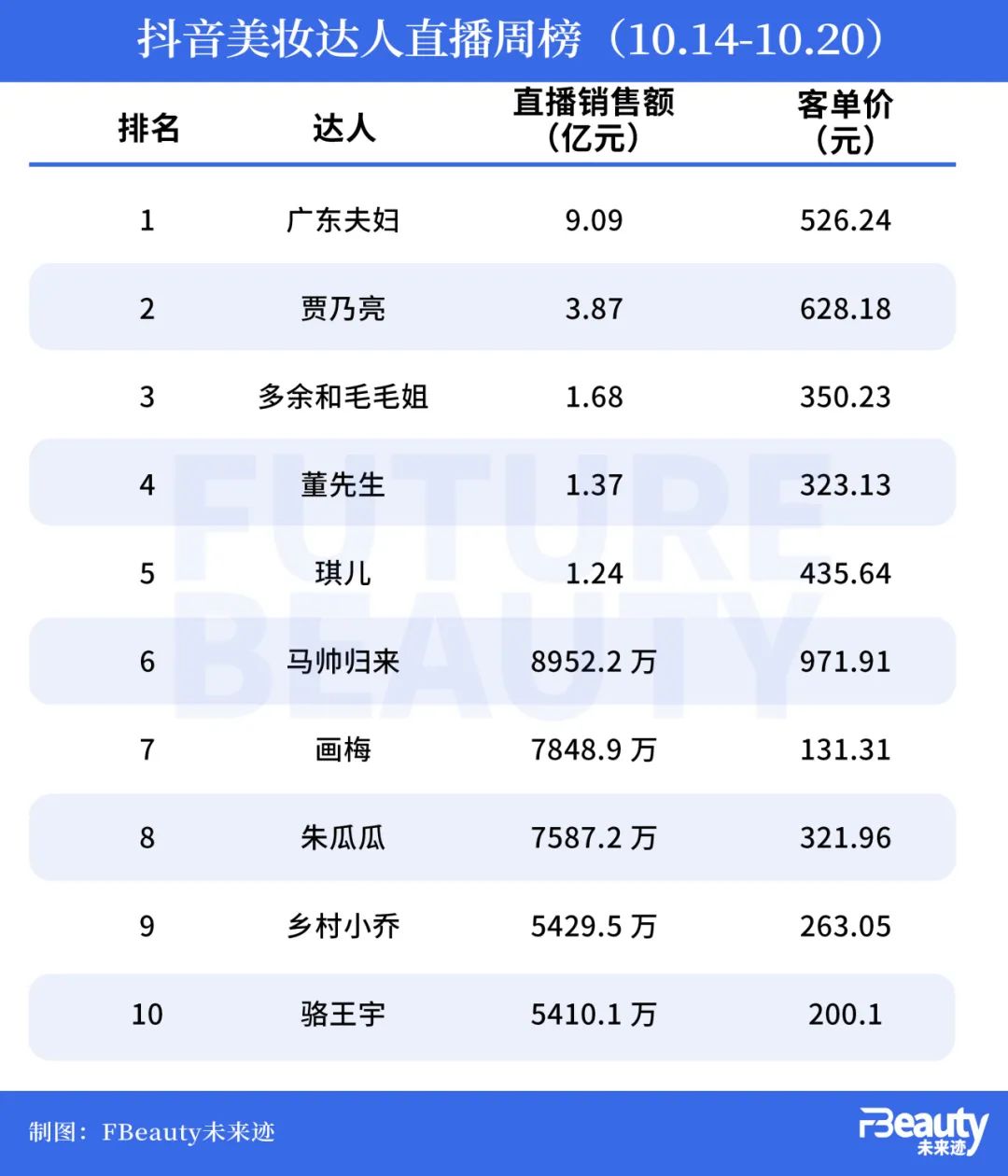 广东夫妇自10月15日开播,至20号抖音开门红三天结束,总共播了7场,场均GMV达到1.3亿,总GMV 9.09亿元,与抖音平台达播第二名贾乃亮,第三名多余和毛毛姐等形成断层优势。