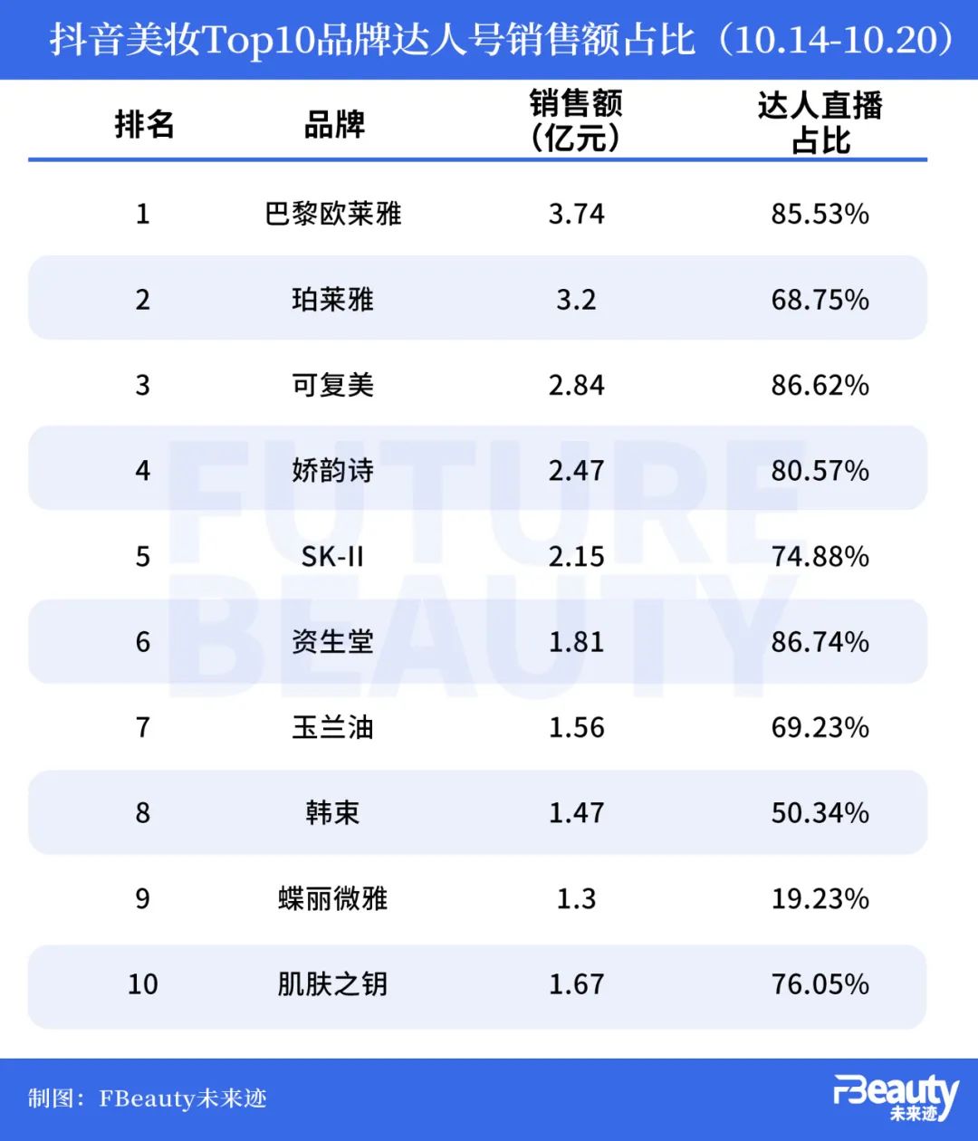 抖音美妆Top10(截至20日的一周中):欧莱雅、珀莱雅、可复美、娇韵诗、SK-II、资生堂、韩束、蝶丽微雅、肌肤之钥;