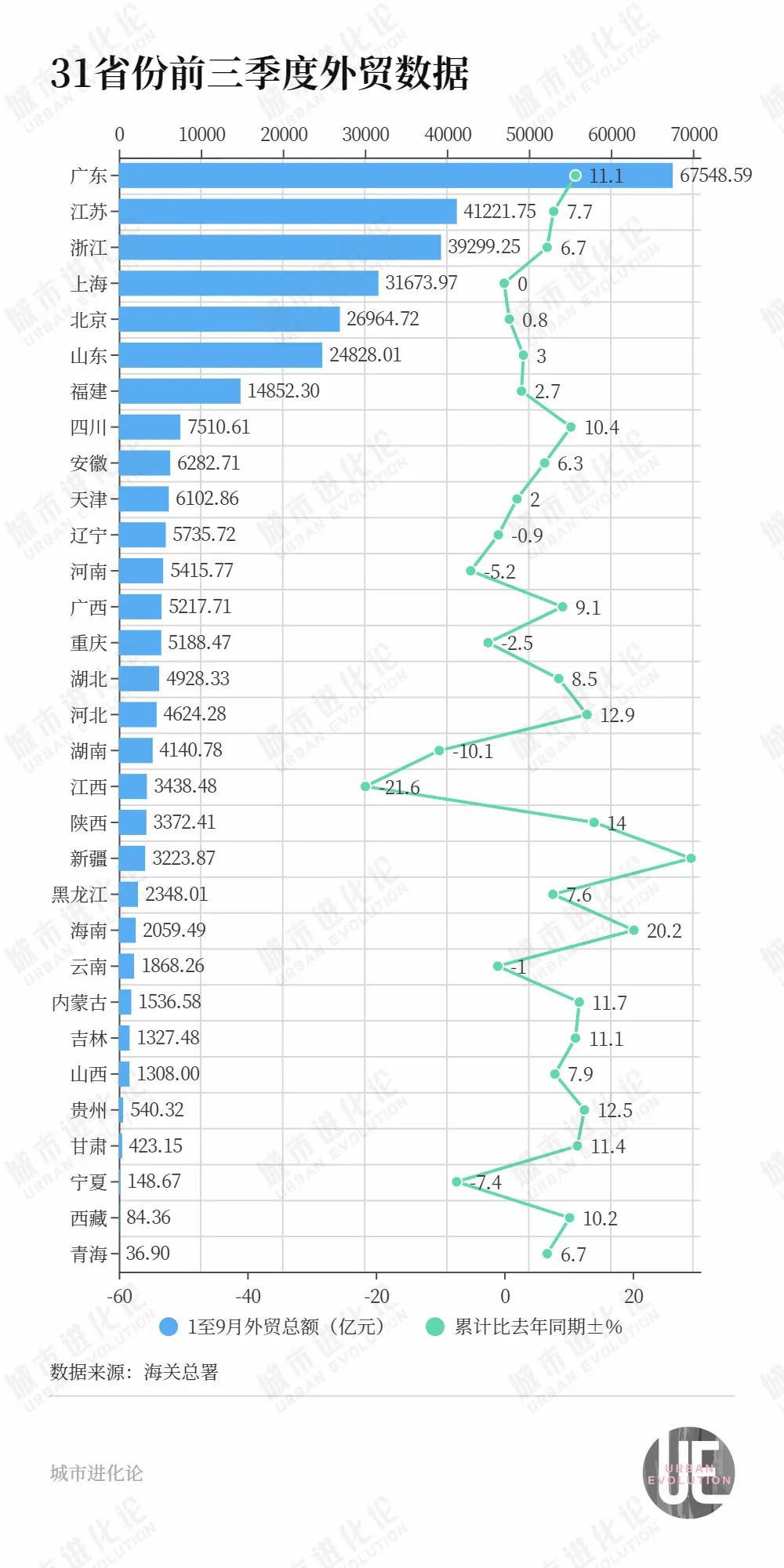 头部恒强,总量上,7个外贸省份实现前三季度进出口总额破万亿,分别是广东、江苏、浙江、上海、北京、山东以及福建。排在前三位的广东、江苏和浙江,前三季度进出口分别是6.75万亿元、4.12万亿元、3.93万亿元,合计占全国外贸总额比例超45%。