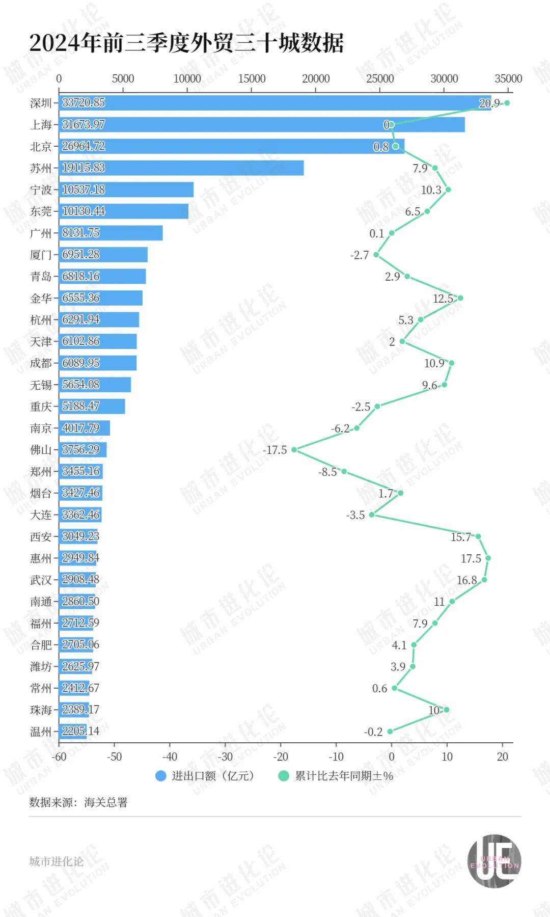 深圳前三季度的外贸增速高达20.9%,增速在外贸TOP30城中排名第1位。前三季度,深圳外贸总额3.37万亿元,占广东外贸额49.92%。