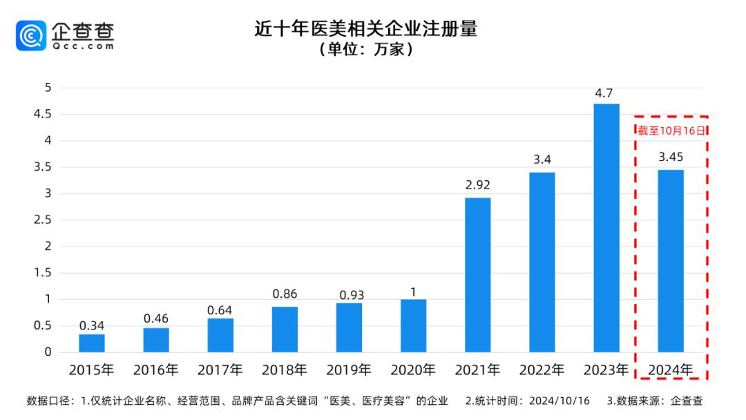 企查查数据显示,我国现存医美相关企业超15万家;近十年,医美相关企业注册量呈持续正增长态势,2021年开始进入高峰期,2021年-2023年注册量分别为2.92万家、3.40万家、4.70万家,截至10月16日2024年已高达3.45万家。