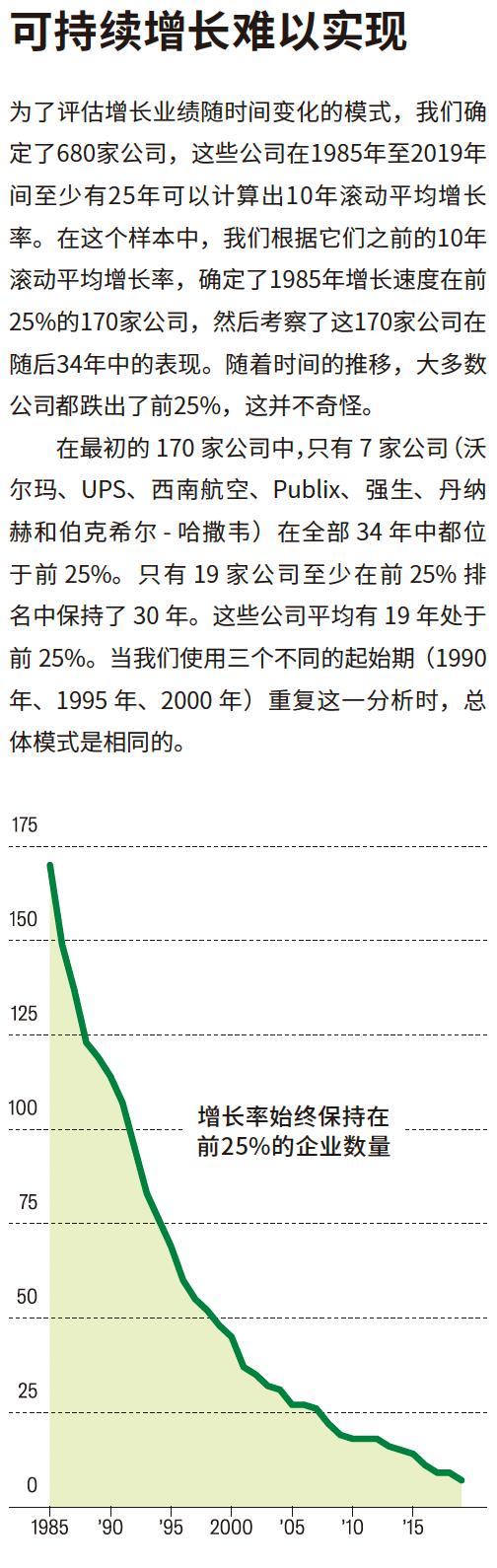 尽管持续的盈利性增长几乎是所有公司的普遍目标,但对许多公司来说,这难以实现。我和其他人对美国公司长期增长模式进行的实证研究表明,如果考虑到通货膨胀因素,大多数公司几乎没有增长。例如,在对1976年至2019年间10897家美国上市公司的分析中,我和研究助理凯瑟琳·皮纳(Catherine Piner)发现,排名前25%的公司经通胀调整后平均年增长率为11.8%,但排名后75%的公司几乎没有增长(分别为0.3%、0.03%和-0.5%)。而且,大多数位于前25%的公司无法维持优异的增长表现超过一定年限。尽管实现持续的可观增长具有挑战性,但并非不可能。在分析中,我们发现在1985年处于前25%的高增长公司中,只有约15%的公司能够在至少30年的时间里维持它们前25%的表现。