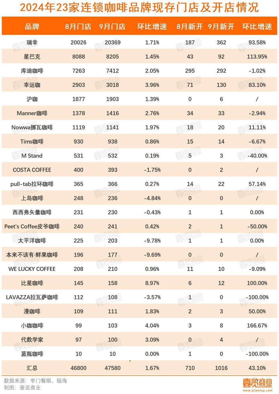 9月,壹览商业长期跟踪的23家咖啡连锁品牌现存门店数量与上月相比增加780家,环比增长1.67%,几乎持平。