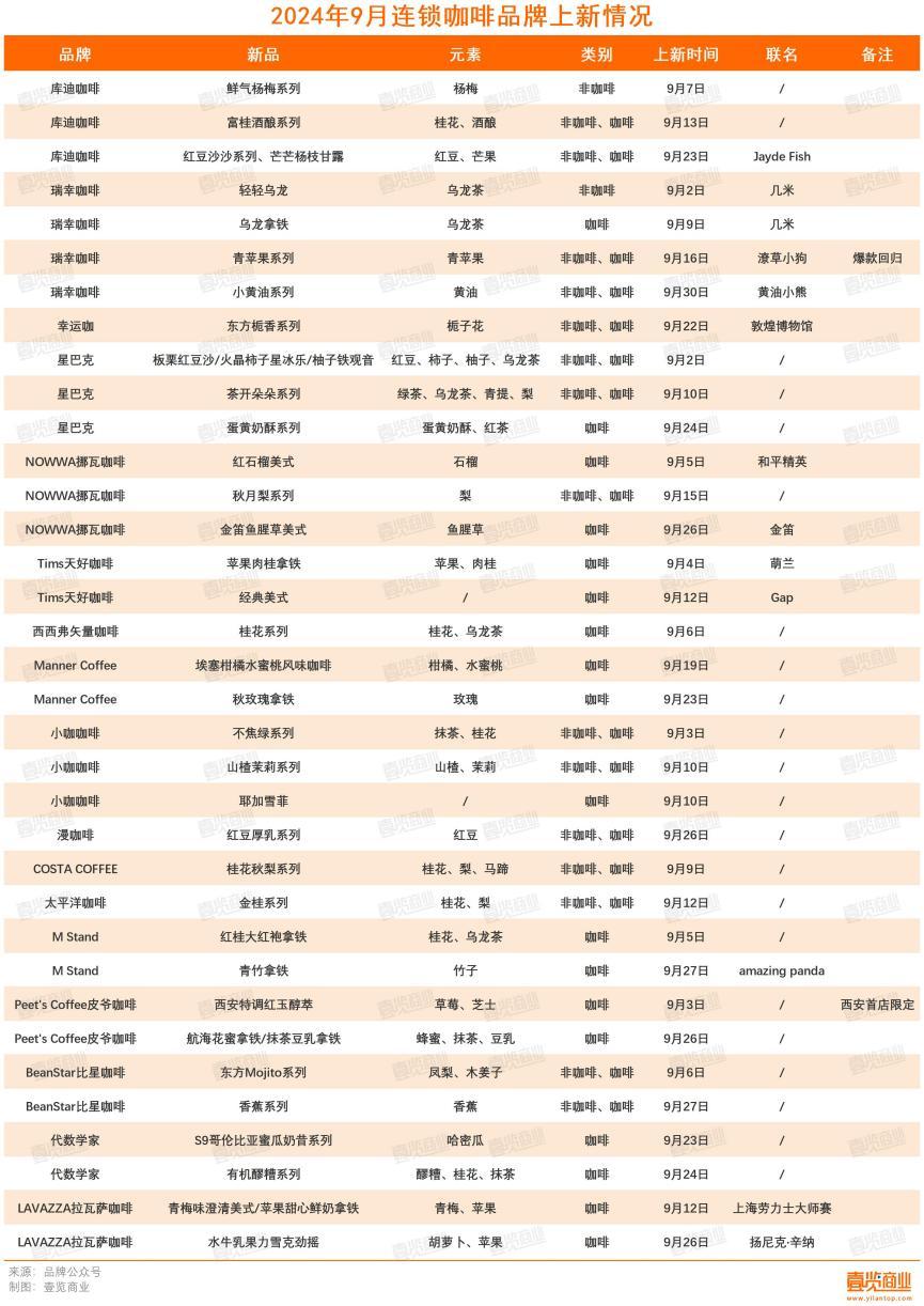 据壹览商业不完全统计,9月,23家连锁咖啡品牌推出至少35个系列新品,平均每天都有新口味的咖啡喝。从使用的元素看,桂花、红豆、酒酿这类带有秋冬气息的新品出现频次较高,果咖依旧是上新主角,至少有18款含果类新品上市,苹果和梨成为换季时刻的热门水果。
