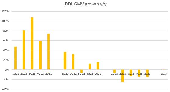 然而,当下DDL面临的最大问题是,其竞争对手的规模越来越大,并且正在获得相对份额。拥有规模和较大的市场份额对于 DDL 这样的市场模式非常重要,因为它们需要足够的供应来吸引需求(消费者),而对于想要与 DDL 合作的供应商来说,DDL 需要证明他们拥有足够的消费者基础。当 DDL 增长时,这种飞轮效应非常有效。然而,正如您所看到的,这是一把双刃剑,因为当 DDL 开始失去供应商(由于消费者数量减少,需求减少)和消费者(由于供应商决定结束合作伙伴关系,供应减少)看到负增长。