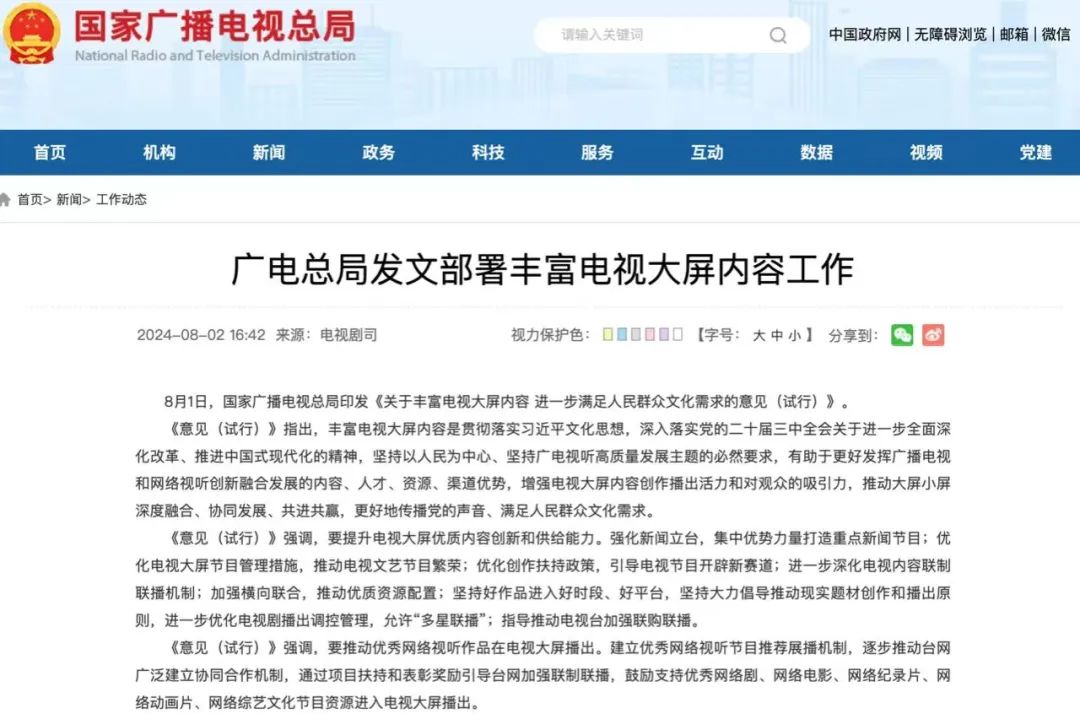 今年8月,国家广播电视总局发布《关于丰富电视大屏内容,进一步满足人民群众文化需求的意见(试行)》,其中明确提出,推动大屏小屏深度融合、协同发展、共进共赢,“鼓励支持优秀网络剧、网络电影、网络纪录片、网络动画片、网络综艺文化节目资源进入电视大屏播出”, 此举无疑加速推进了微短剧的精品化之路。