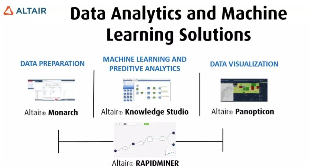 最后,在数据分析和机器学习方面,则涵盖了一个强大的数据和提取工具Altair Monarch、让用户能够使用各种算法构建预测模型Altair Knowledge Studio、让允许用户创建、修改和使用不同的数据可视化方案Altair Panopticon和拥有一套完整的数据科学和预测分析工具的RapidMiner。