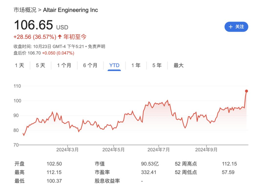 今年以来,Altair 股价已上涨 27%,市值达到 91 亿美元。