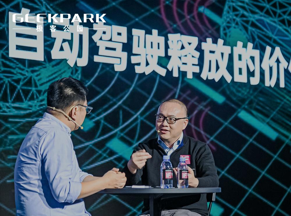 极客公园创新大会 2022 上,张鹏与余凯对谈自动驾驶释放的巨大价值以及路线之争 | 图片来源:极客公园