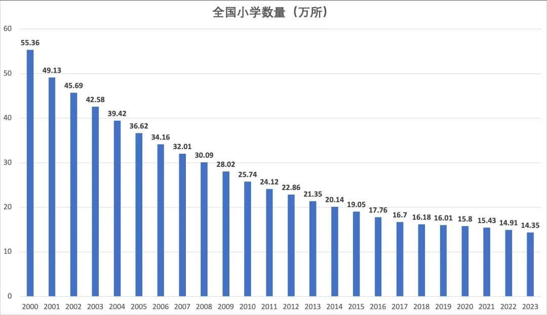2000年,全国小学有55.36万所,其中乡村小学数量为44.03万所;|2021年,全国小学15.43万所,其中乡村小学数量仅为8.14万所。