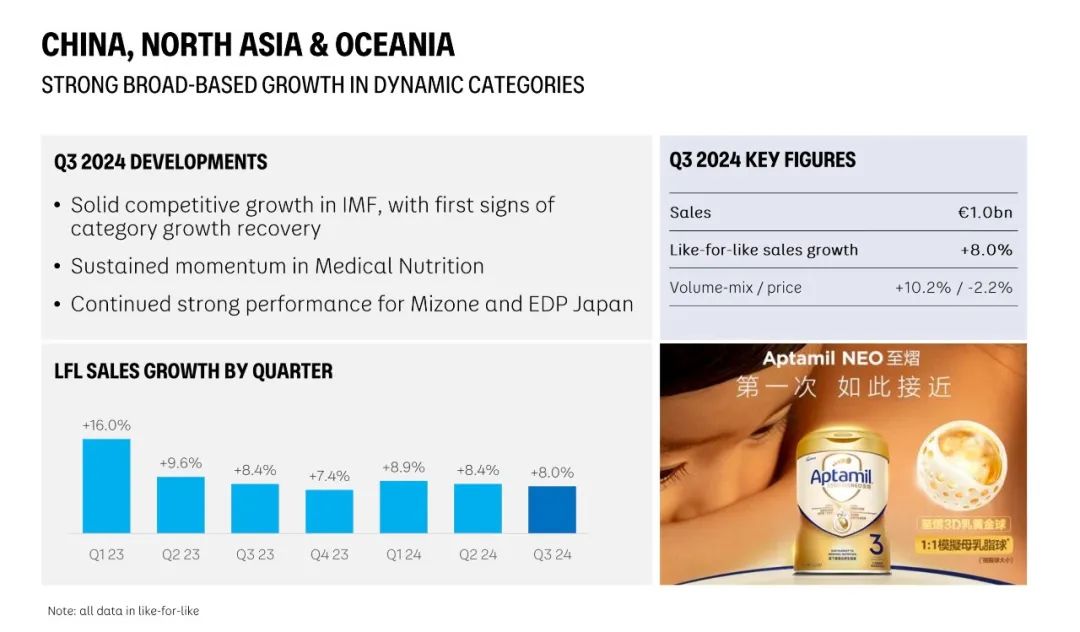 看过脉动的表现后,我们来看看中国所在的大区整体表现。三季度,CNAO大区的收入为9.67亿欧元,同比增长8%。其中,奶粉所在的专业特殊营养业务期内实现收入6.20亿欧元,同比增长7.7%。