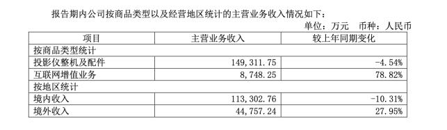 我们首先来看其核心数据表现:今年上半年,极米营业收入15.99亿元,其营业收入大部分由投影仪硬件层面的营收所贡献,报告期内,其投影仪整机及配件实现营收14.93亿元,同比下降4.54%。分地区来看,境内收入约为11.3亿元,同比下降10.31%,境外收入为4.47亿,同比增长27.95%,虽然抵消了国内需求疲软的影响,但海外营收整体占比还是不高。