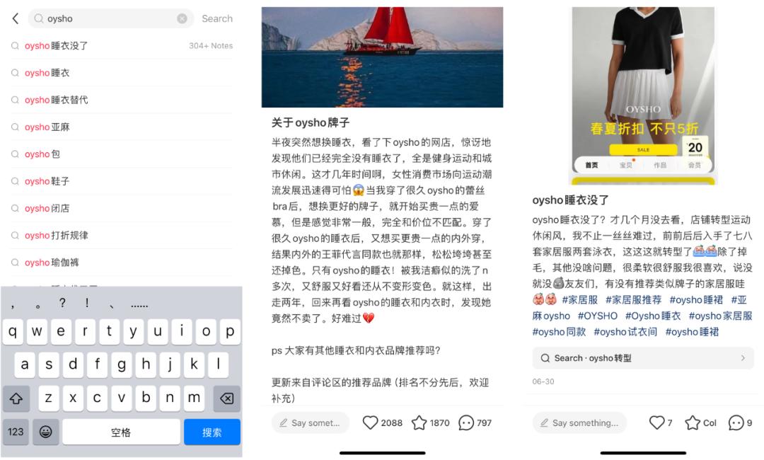 一方面,运动休闲风的发力混淆了品牌的定位,导致了Oysho告别,引来的全是对其睡衣的怀念。在小红书上搜索Oysho,引入眼帘的尽是早期消费者在怀念做睡衣的Oysho,和寻找睡衣替代品。