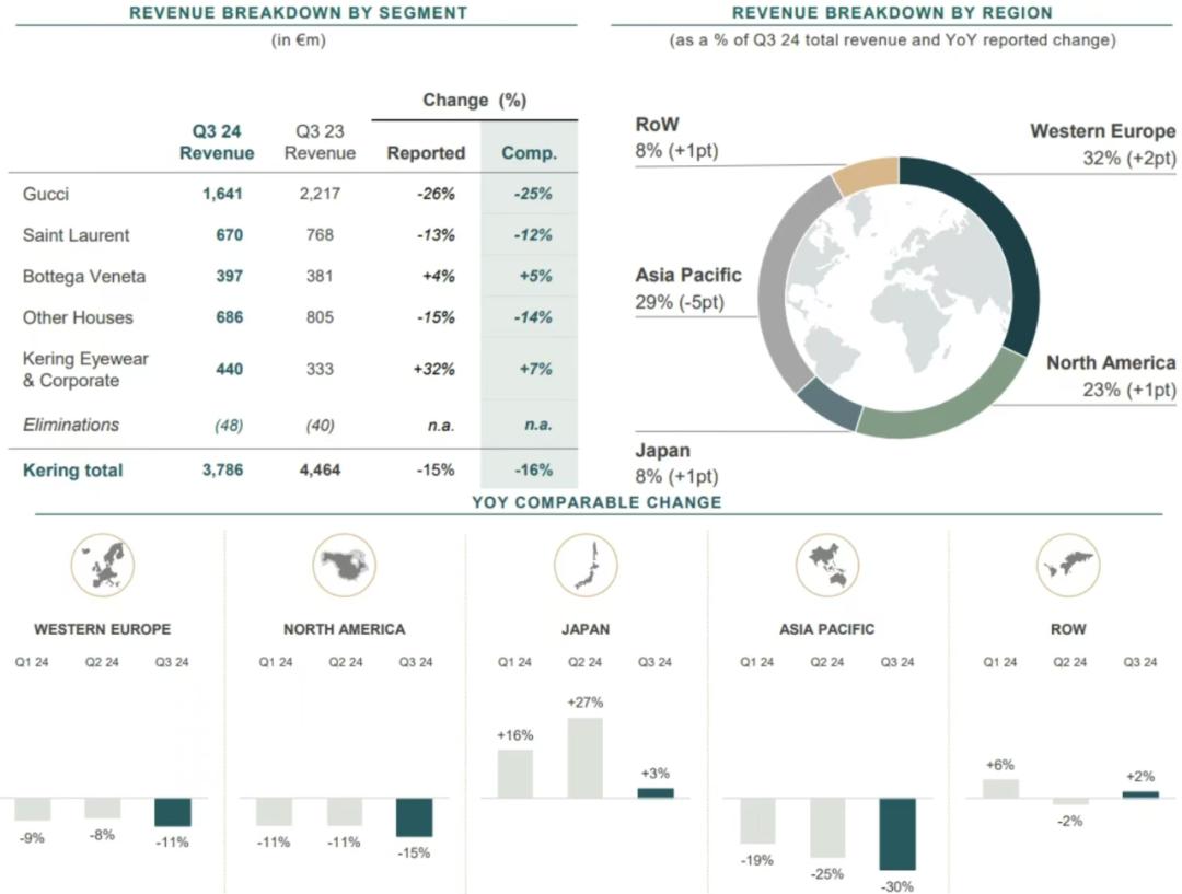 当然,奢侈品卖不动的现象,不只是出现在开云集团。今年上半年,除爱马仕集团外,历峰集团、开云集团、LVMH集团的营收和净利均下滑(详见),亚太市场(除日本)奢侈品销售大体疲软;另外,在Q3 LVMH集团营收有机下滑3%。