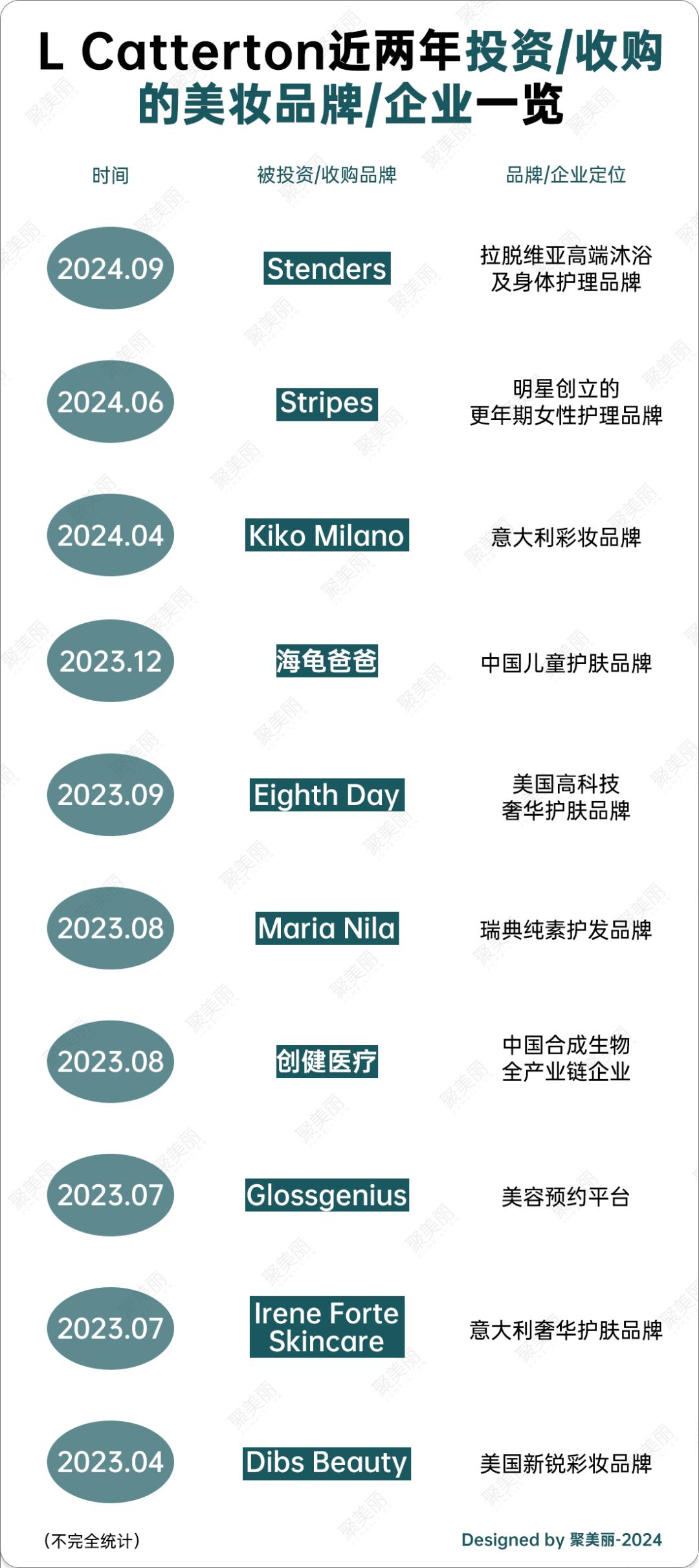 除了开云集团对于美妆的加码外,LVMH等奢侈品巨头也在不断入侵美妆,如LVMH集团仅近两年投资/收购美妆品牌的案例就超过10例,其中包含意大利彩妆品牌Kiko Milano、中国儿童护肤品牌海龟爸爸、拉脱维亚沐浴及身体护理品牌Stenders施丹兰等(详见)。