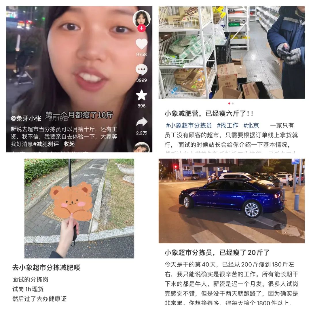 很长一段时间,我总是刷到做分拣员可以减肥的帖子和视频,“几个月内裤子变大一圈,边赚钱边减肥省去健身房的费用……”人们谈起这段经历时故作轻松的语气像讲地狱笑话。有人真的抱着减肥心态去尝试这份工作,有些坚持了下来,有些则落荒而逃,进入下一份“灵活”的工作。