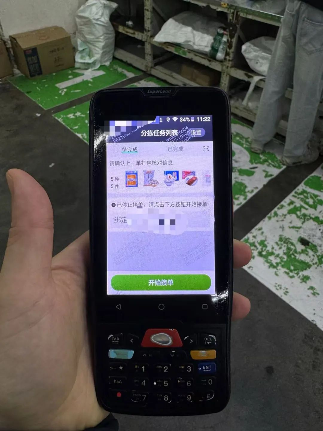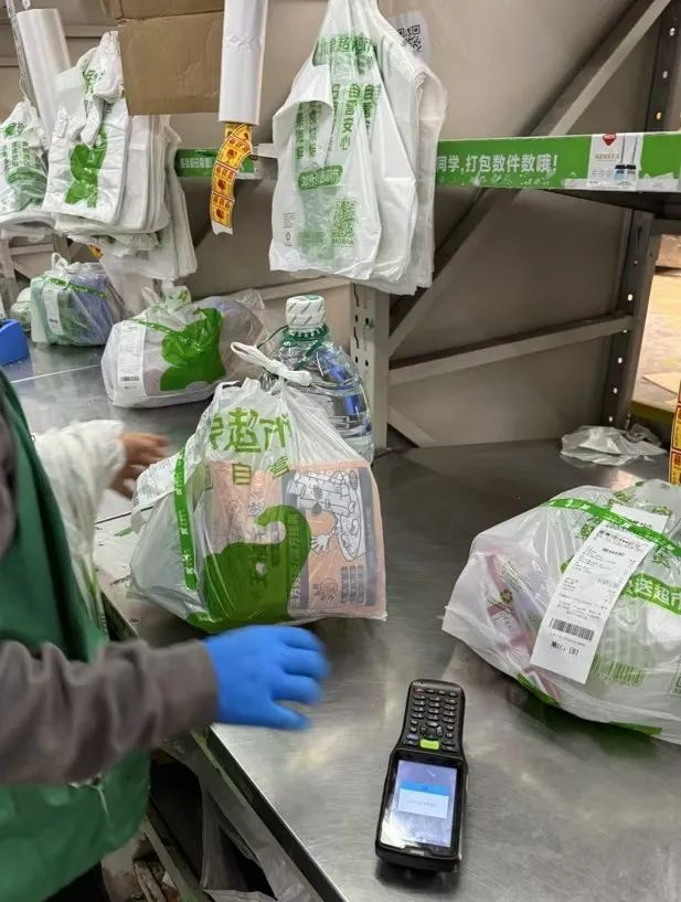 第一天试岗,店长安排了店里的一位分拣员小寒带我。很快我发现,小寒是这里的金牌分拣员。她右手拿着分拣终端机器(PDA),左手挂满了大大小小的袋子,在一排排货架之间穿梭。只要来了单子,PDA便会响起。小寒边拣货边向我展示,根据手上的PDA的数字定位到具体的区域、货架,然后扫码,把货物按照要求装进袋子里。