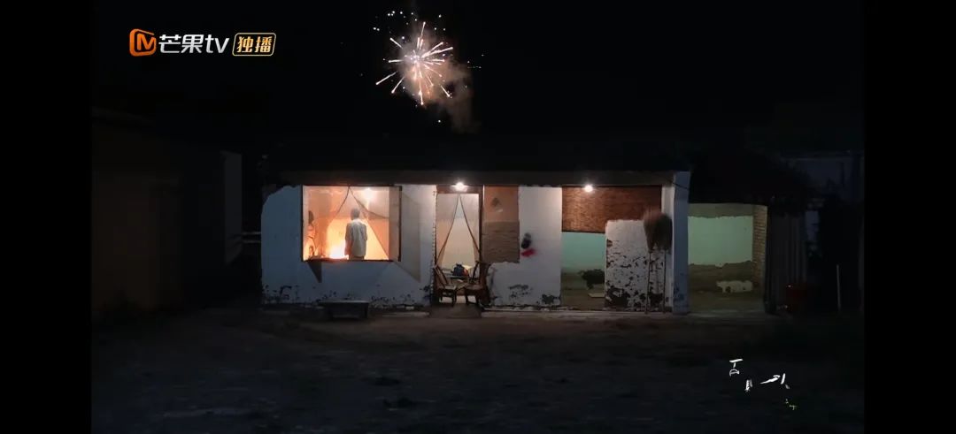不等杨总起锅重新来过,锅里烧了一个钟的油终于爆发。此时,屋外放起了欢迎几位夫妇的烟花,而杨总背着身在欣赏灶台里的火花。