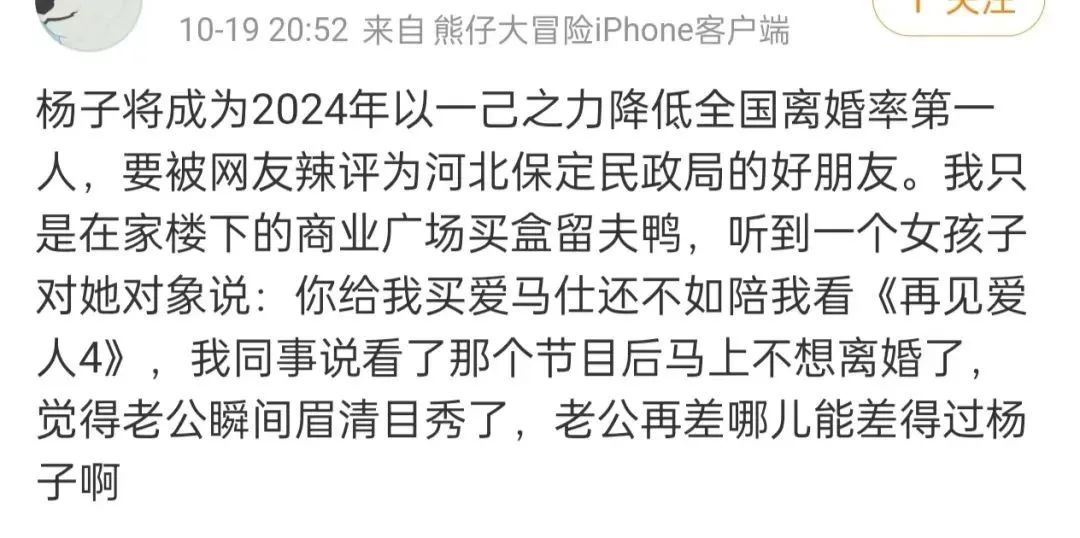 本来对自己伴侣不满的,看完杨子《再见爱人4》里的表现,立刻觉得身边人眉清目秀。